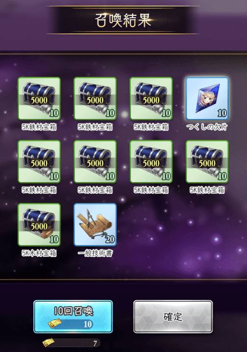![]() | ゴールドガチャチケ10連 全部資材箱が出ないかな?っと見てましたが最高で8個でした。ざんねん |